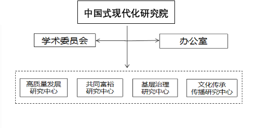 中国式现代化研究院下设四个研究中心和一个办公室:即高质量发展研究中心、共同富裕研究中心、基层治理研究中心、文化传承传播与发展研究中心和研究院办公室。